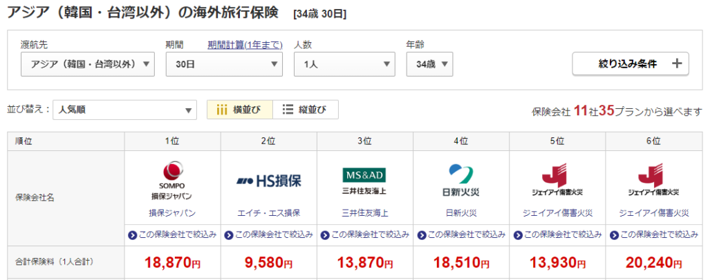 試しにi保険さんのページで「アジア(韓国・台湾以外)」「30日」「1人」「34歳」で検索してみると、このような金額が。